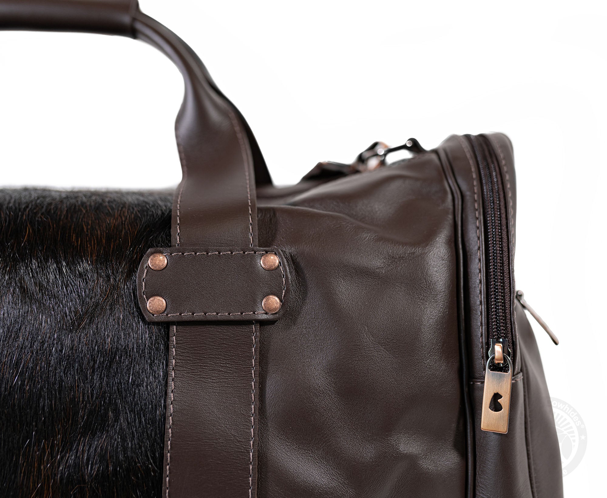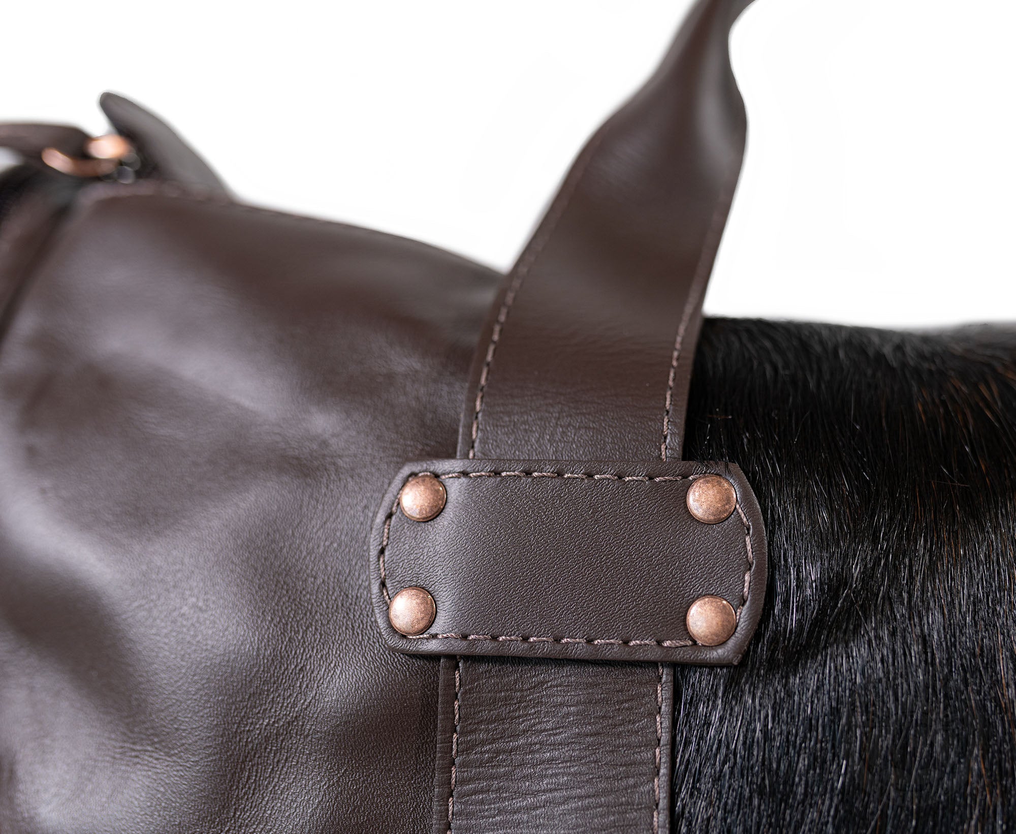 Each bag is made from premium leather and natural cowhide, making every piece one-of-a-kind with unique hide patterns and tones.