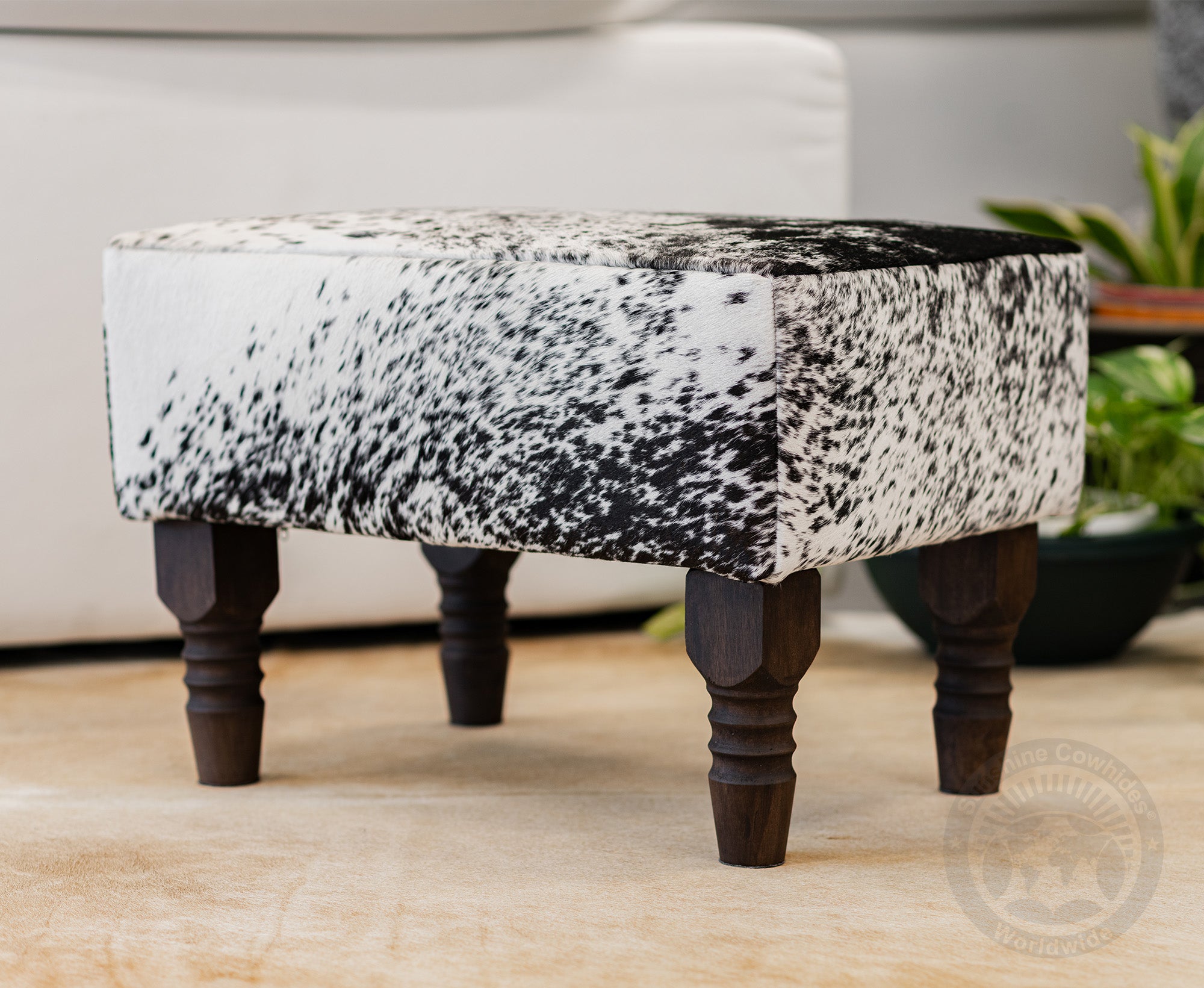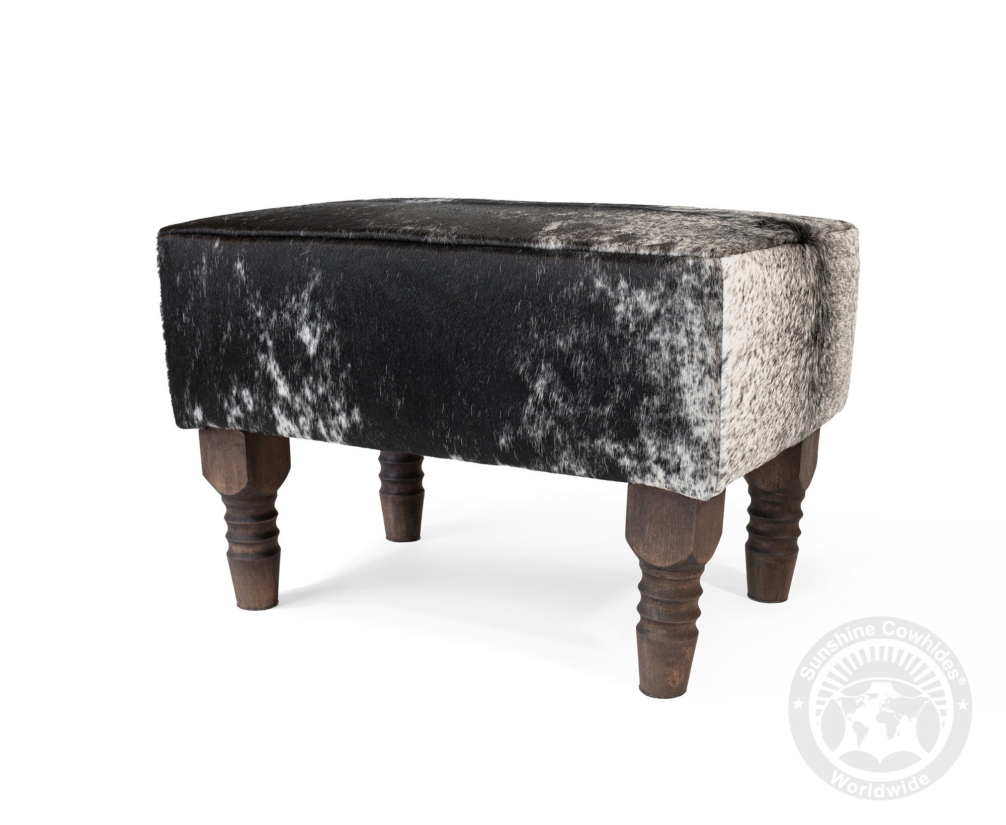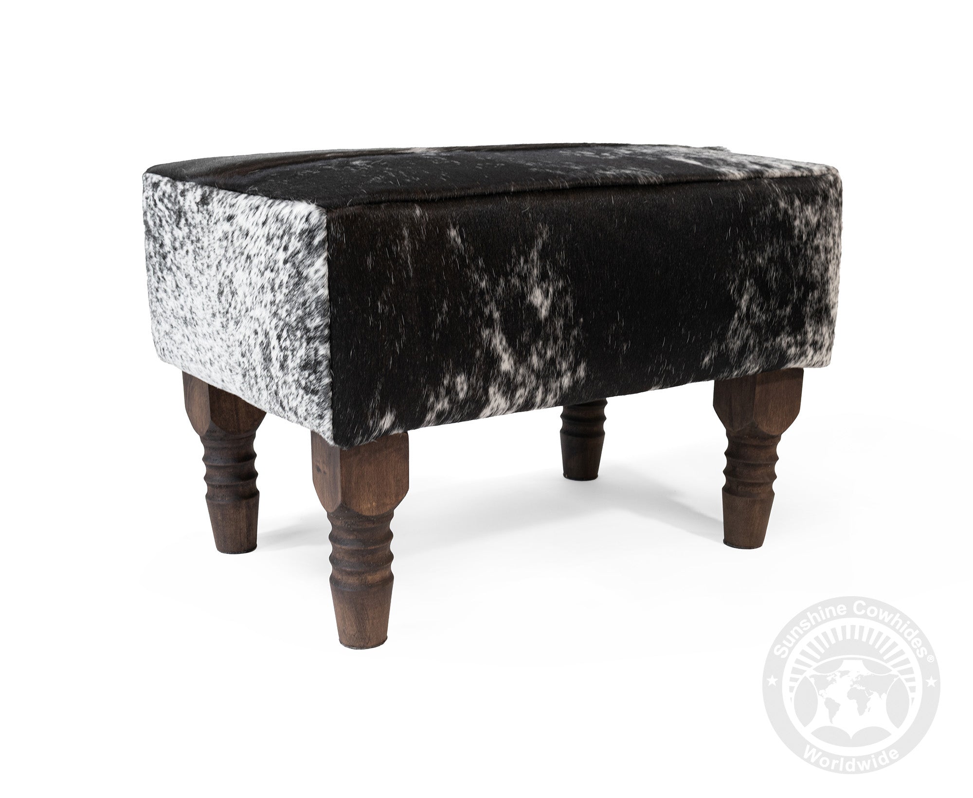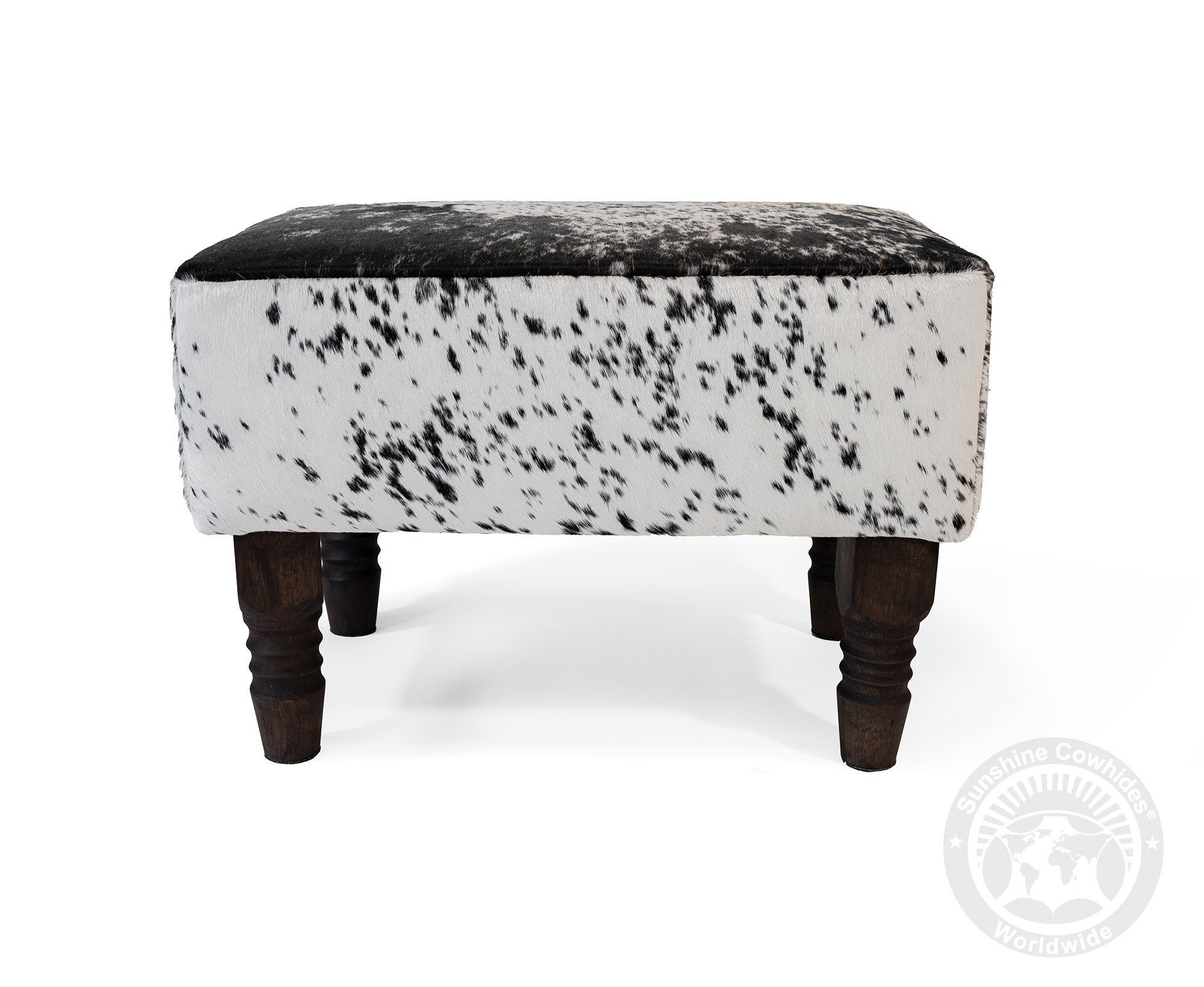 Cowhide Footstool with Wooden Legs - Salt & Pepper Black & White