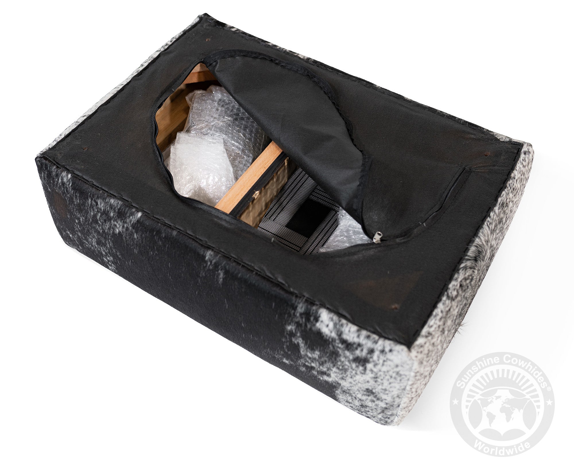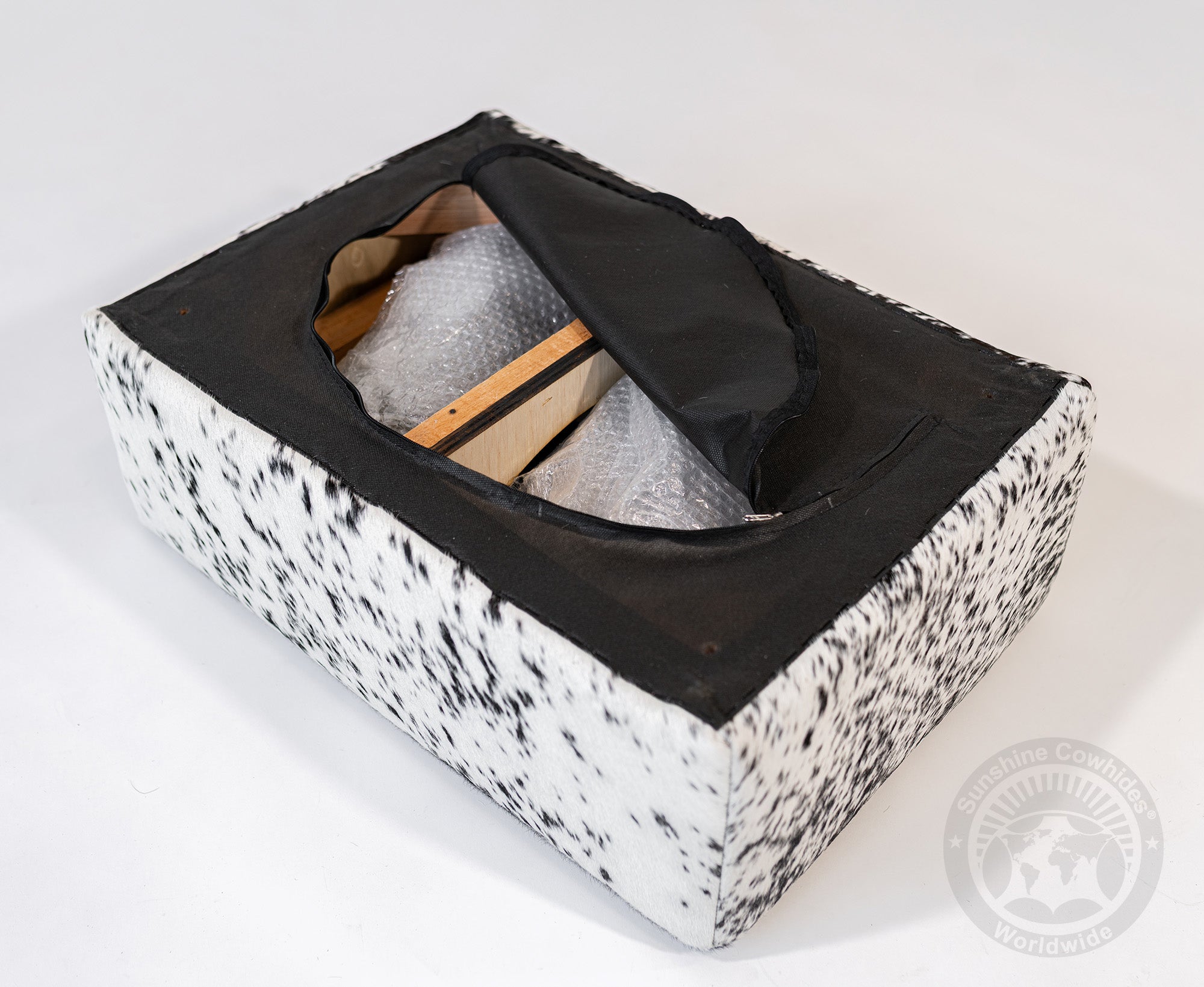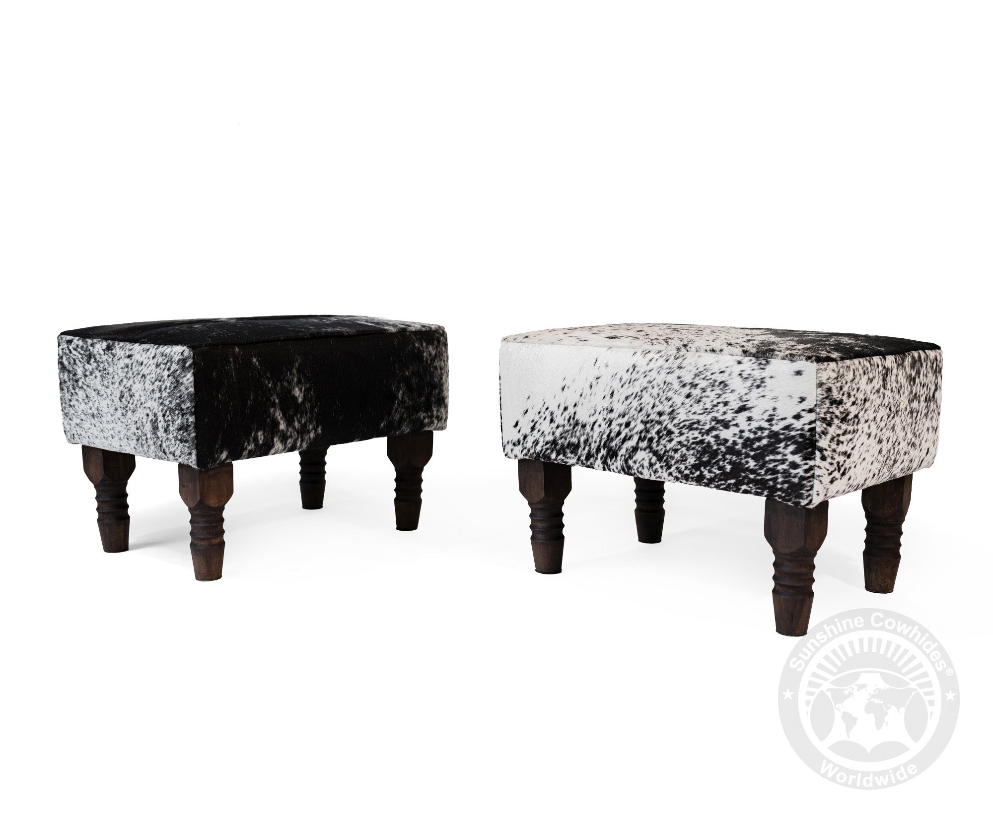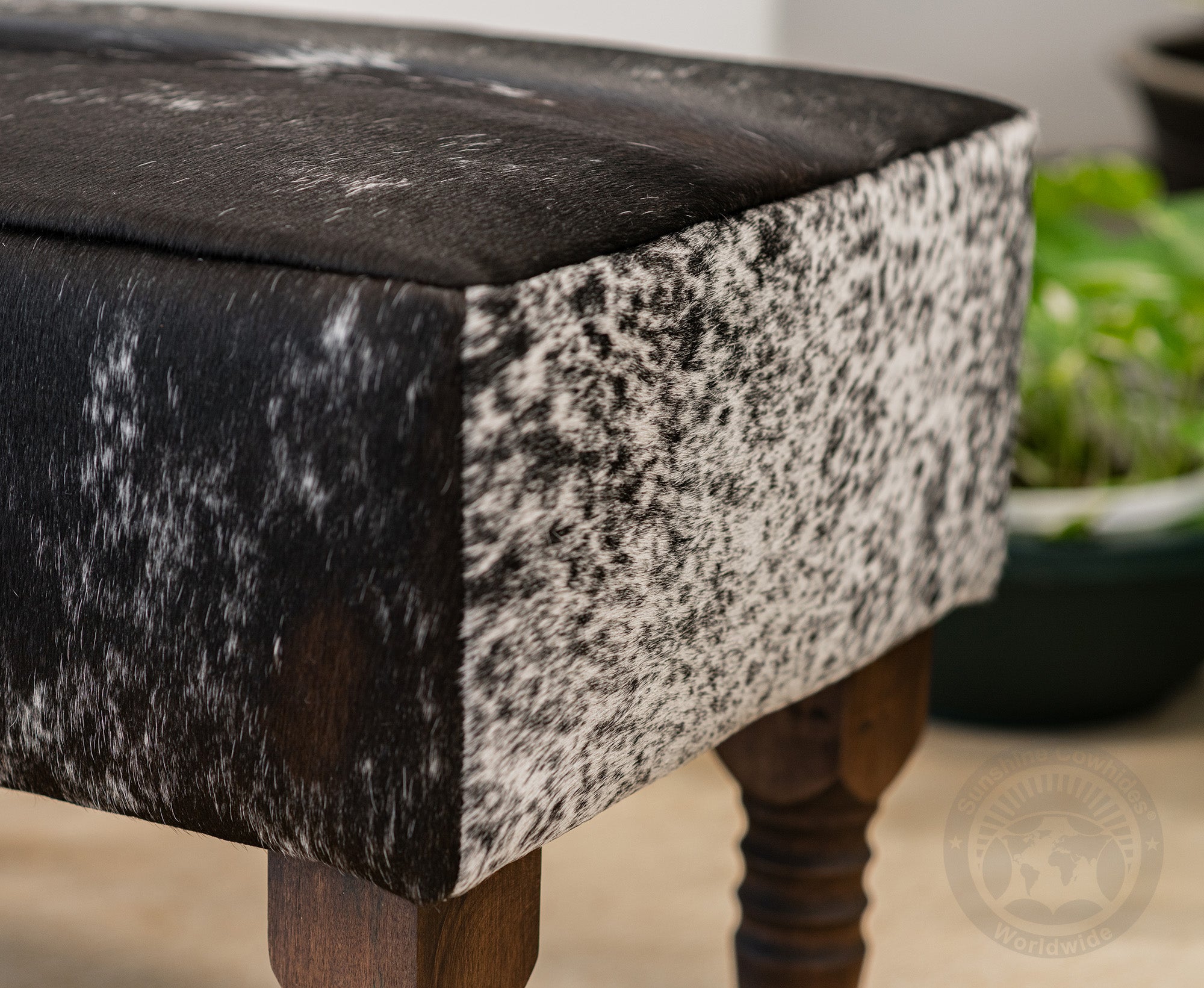 Cowhide Footstool with Wooden Legs - Salt & Pepper Black & White