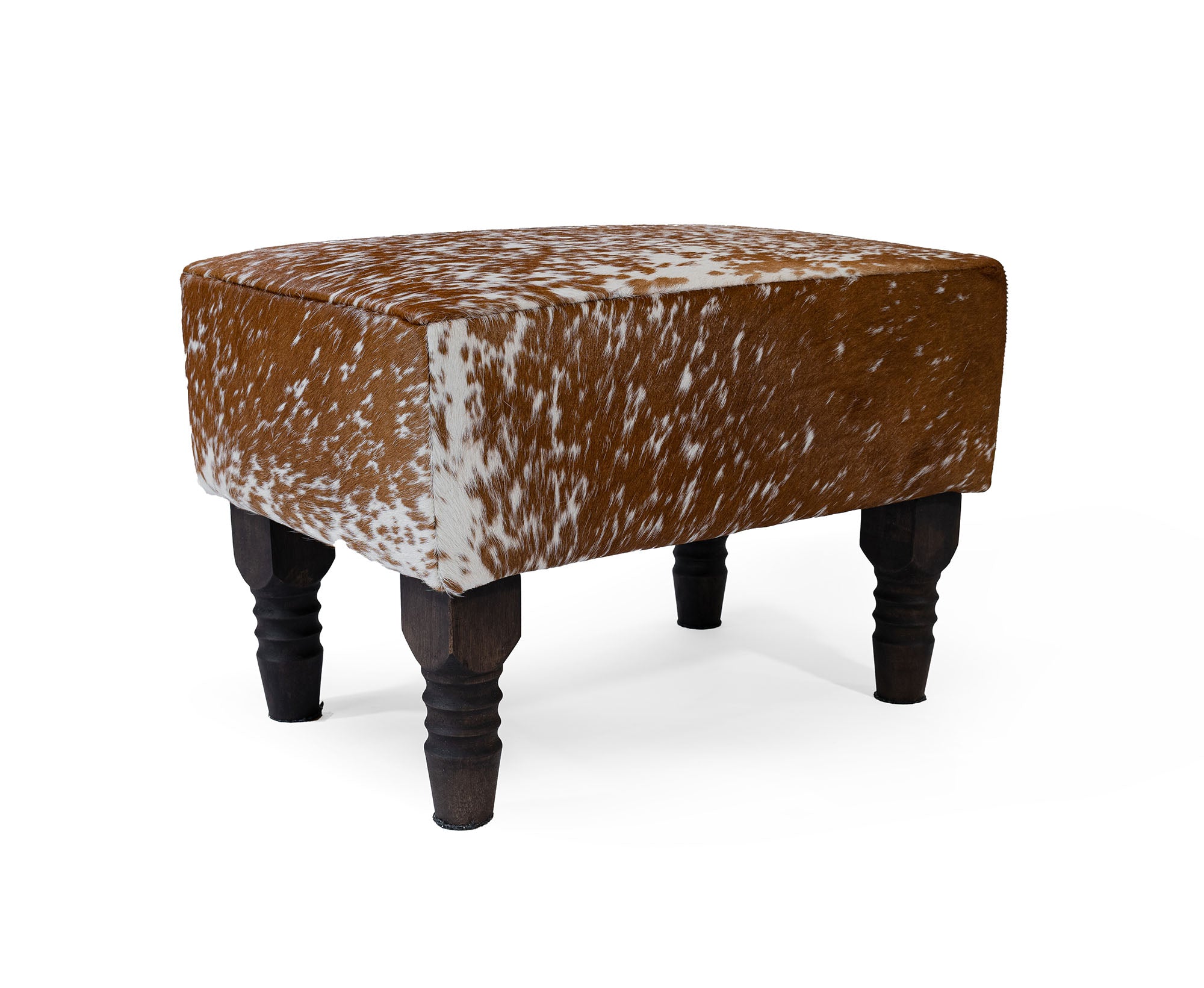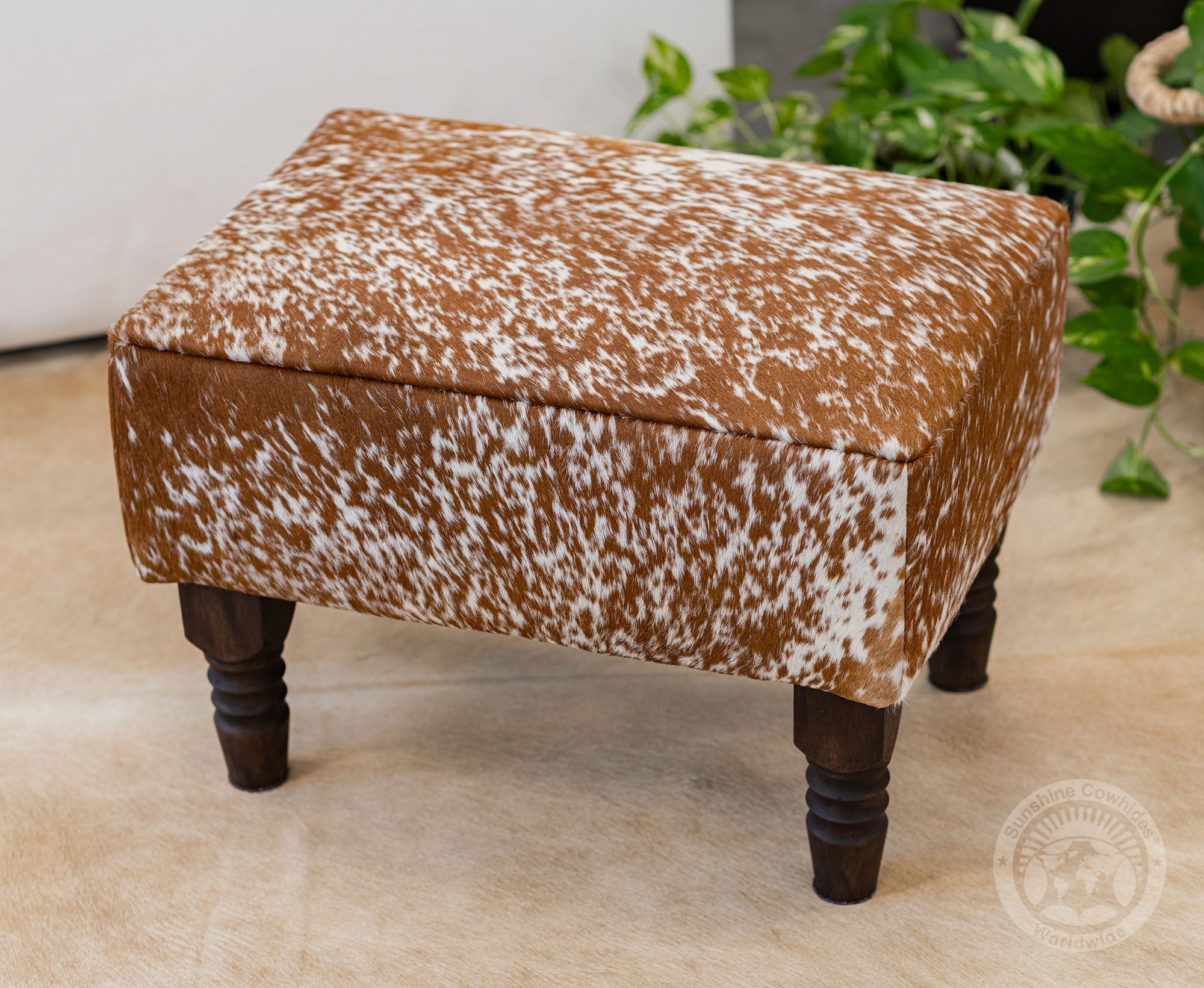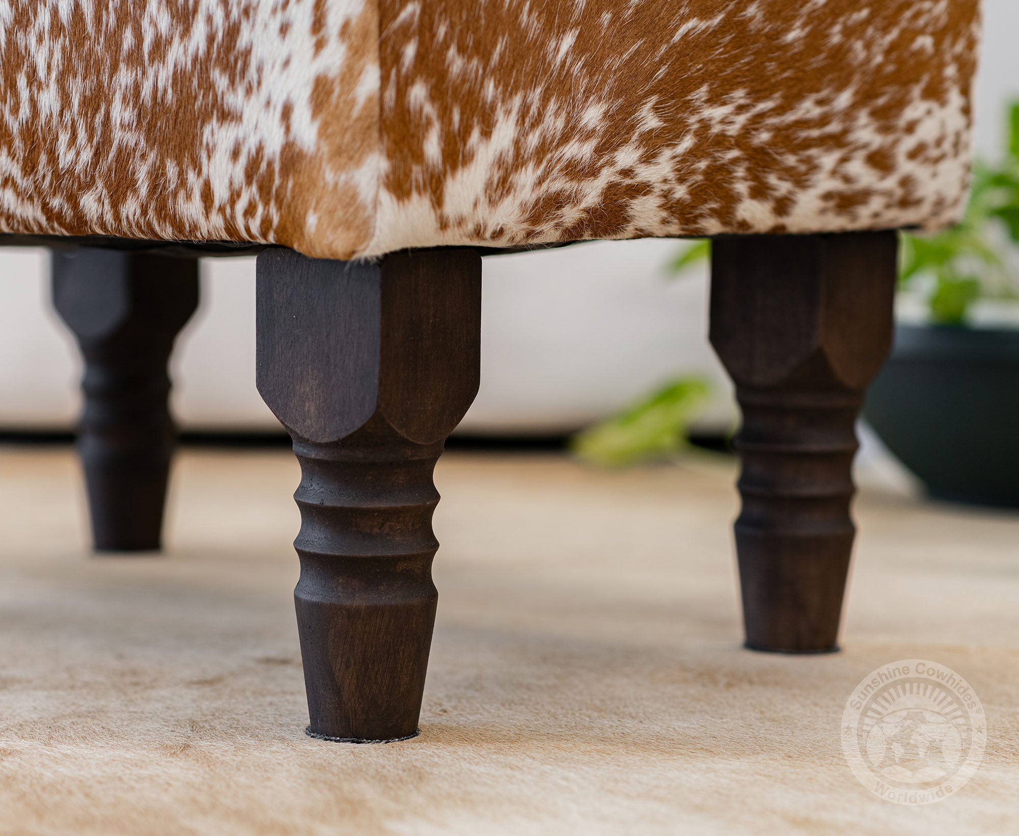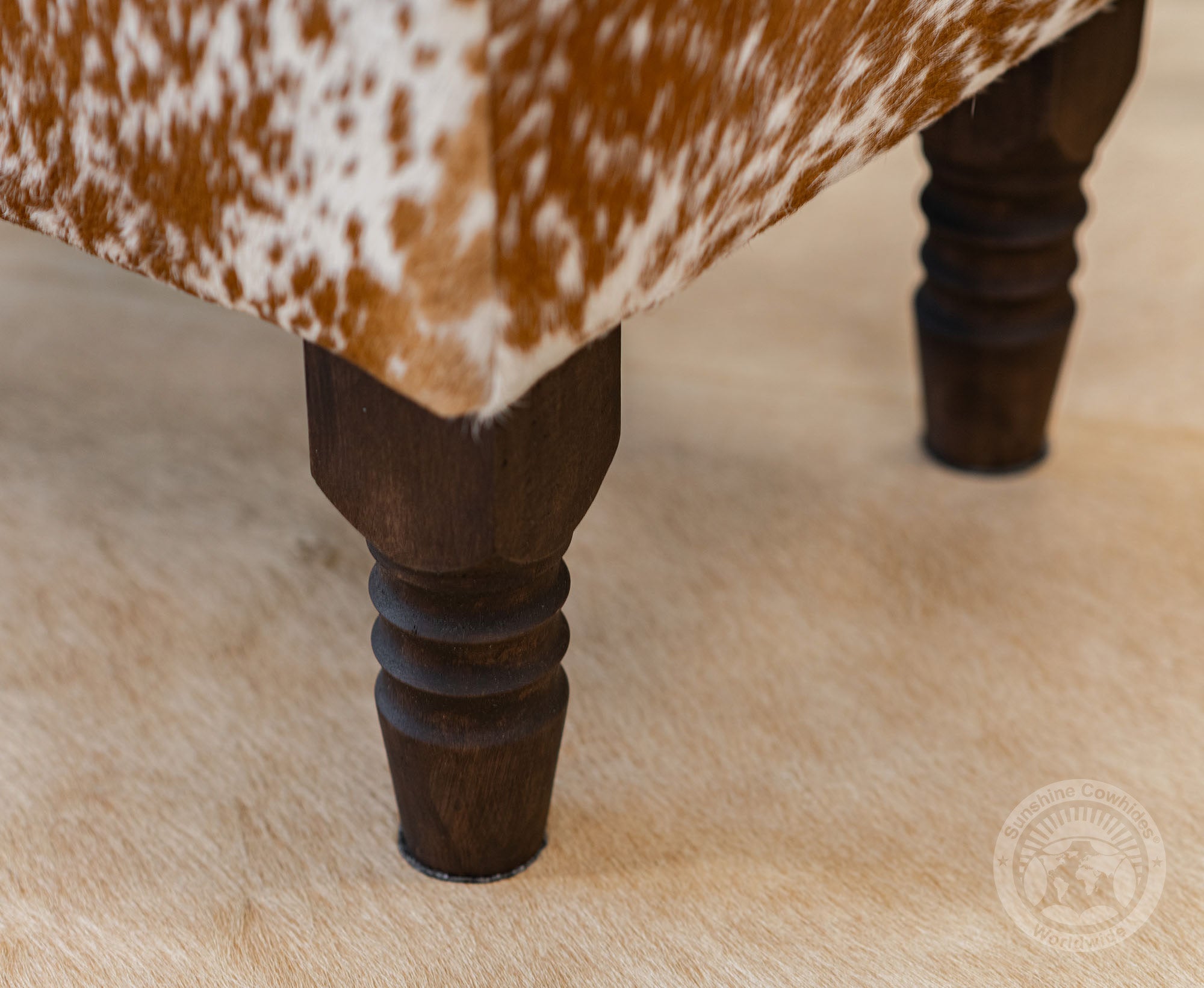 rdy wooden legs offer a strong and stable base, complementing the natural cowhide top.