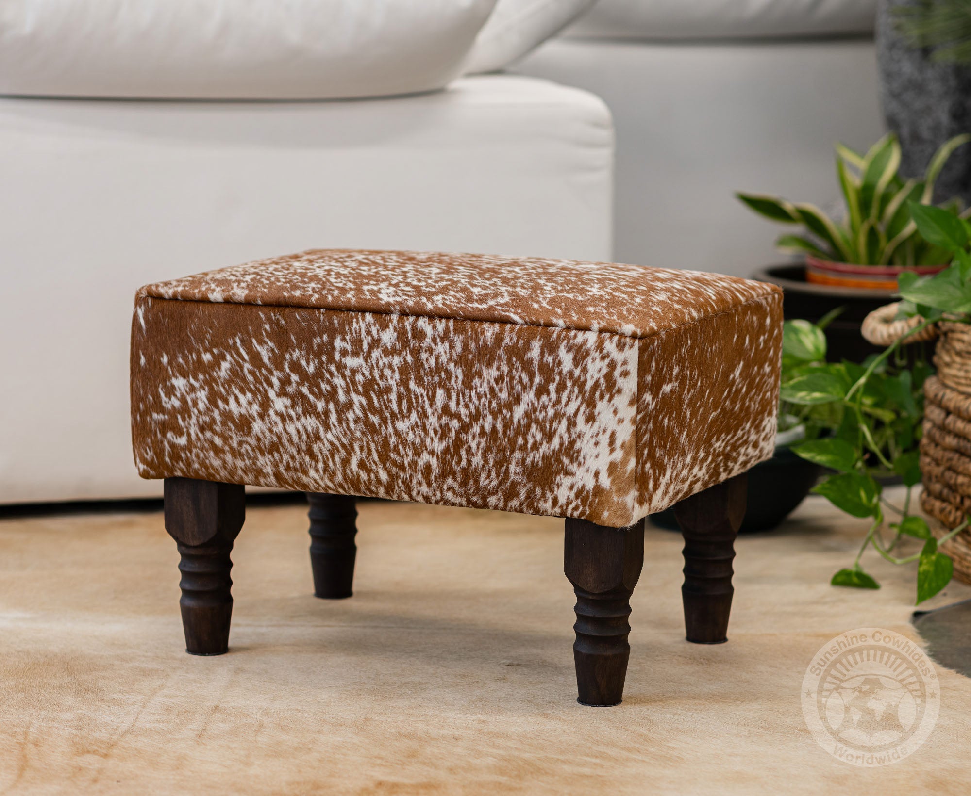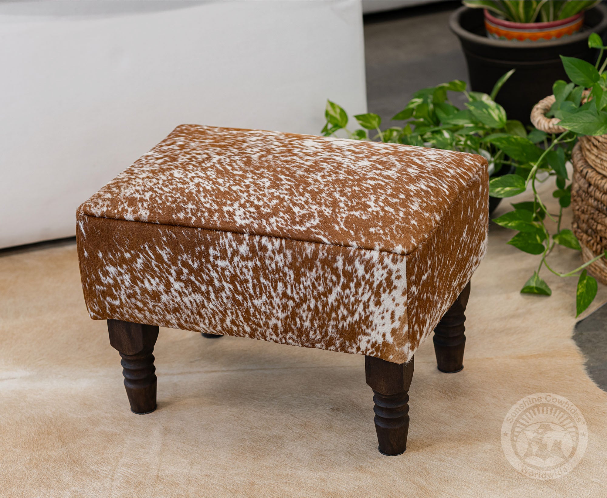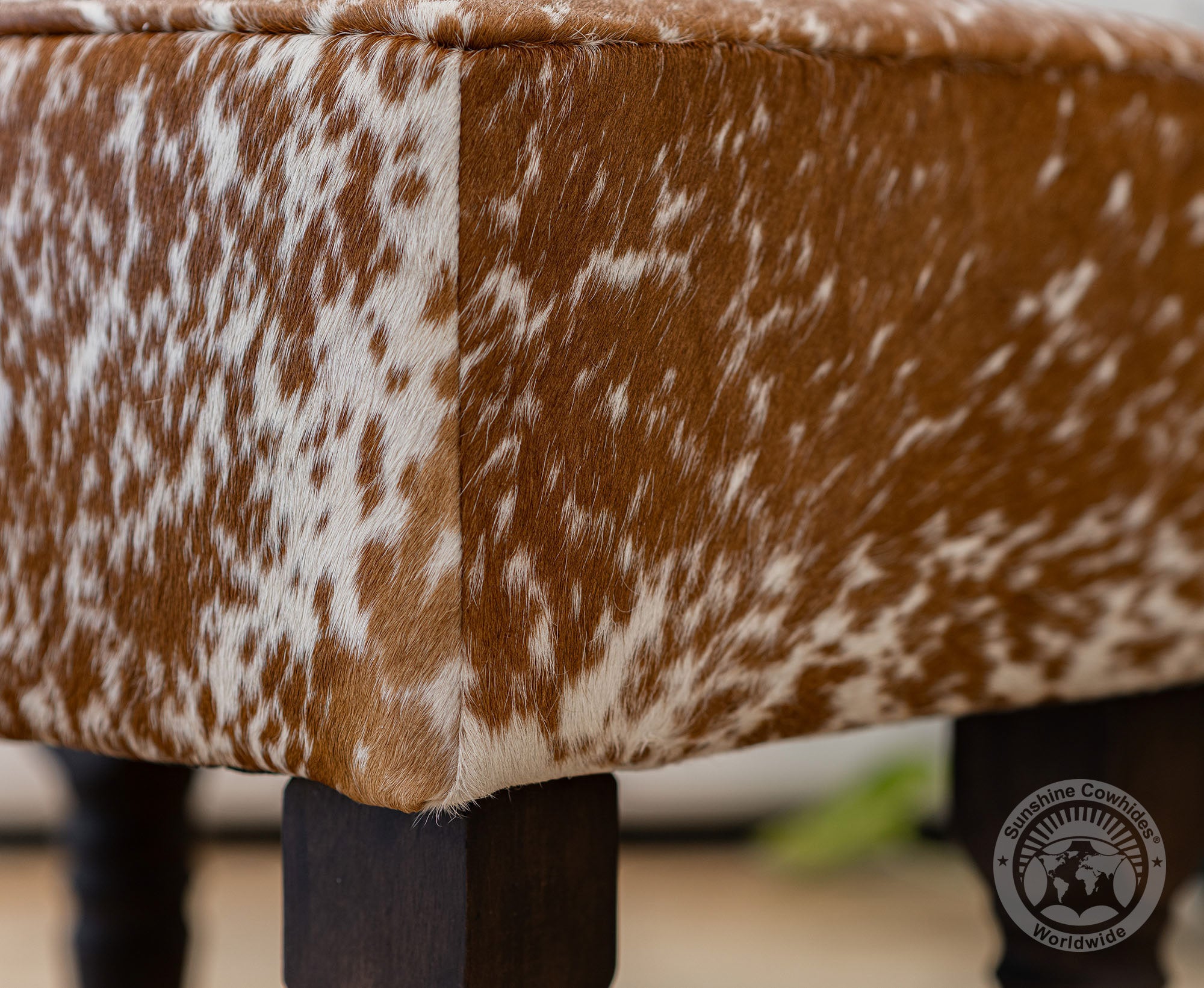 rdy wooden legs offer a strong and stable base, complementing the natural cowhide top.