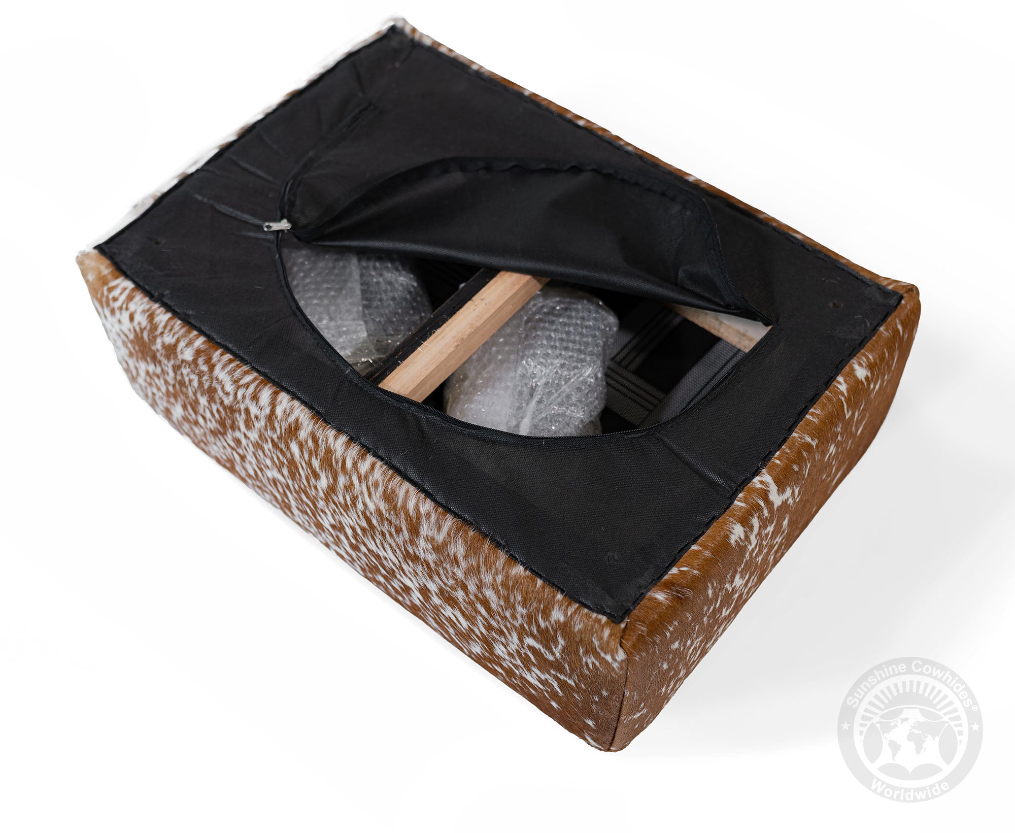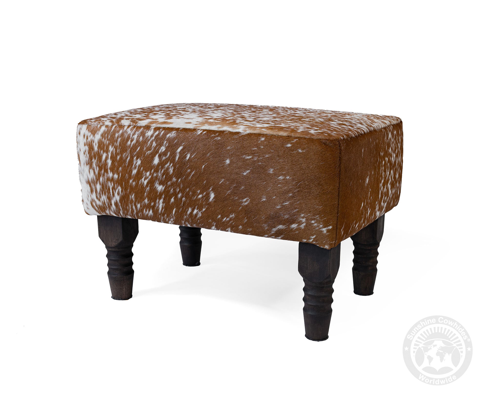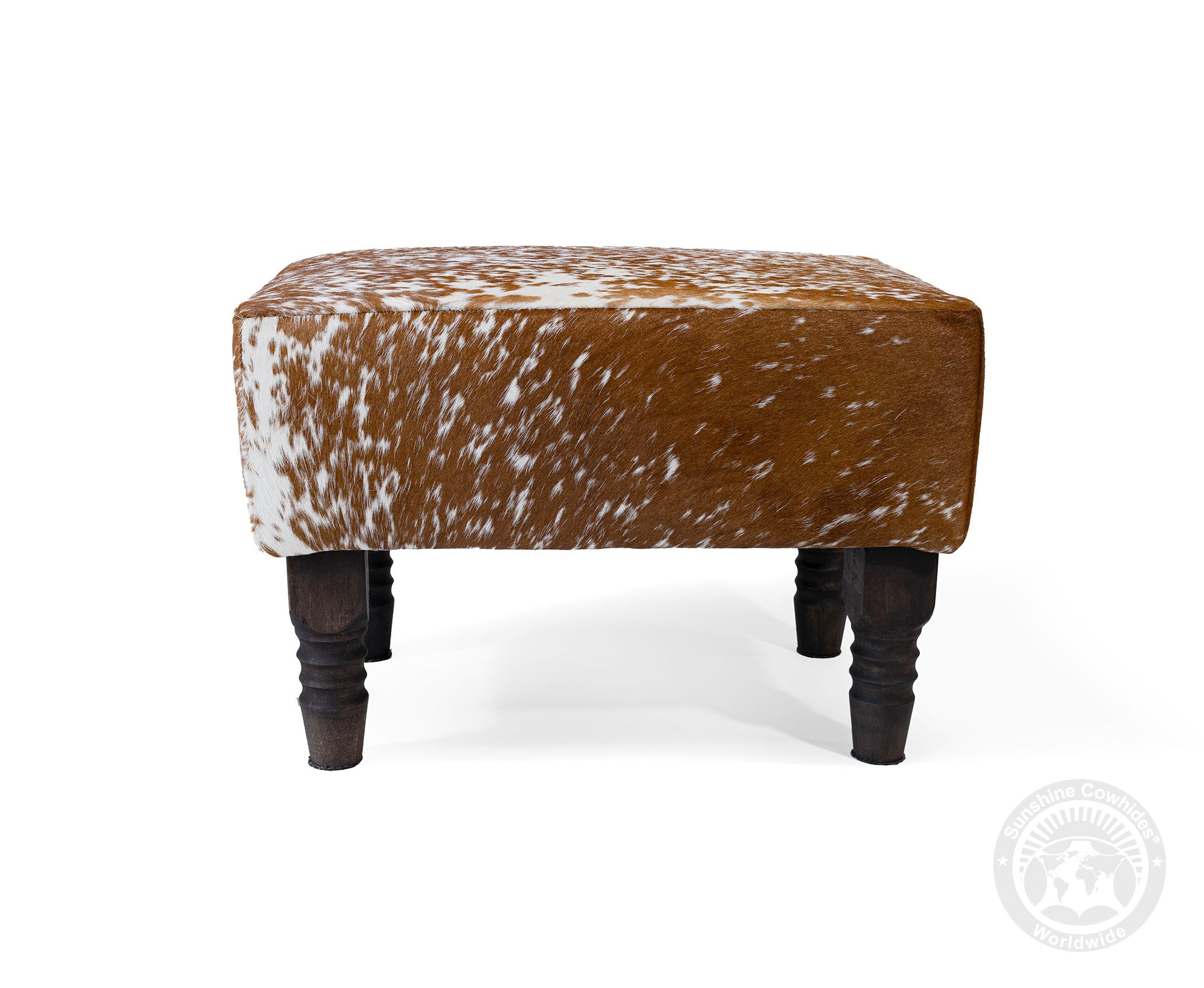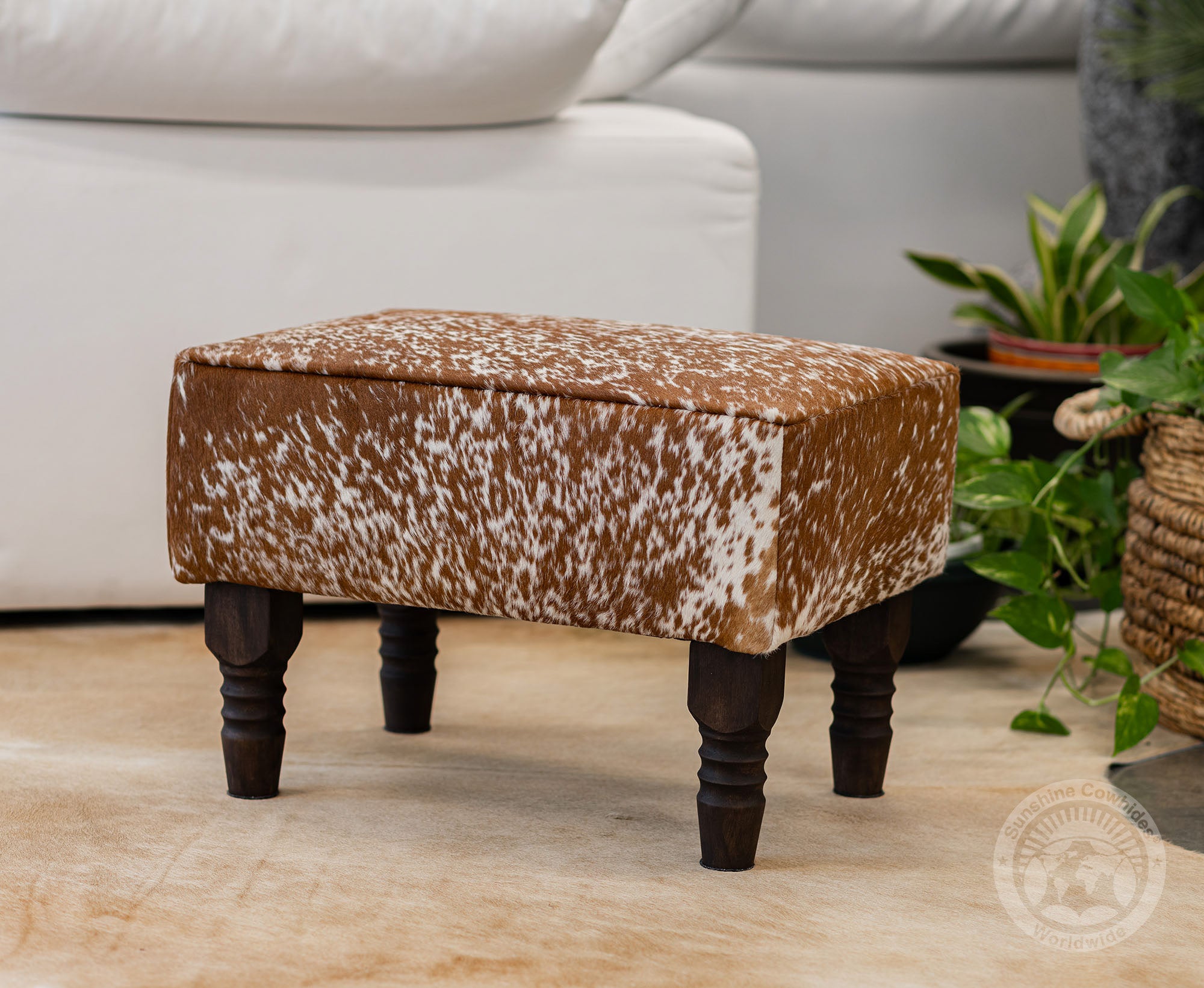 rdy wooden legs offer a strong and stable base, complementing the natural cowhide top.