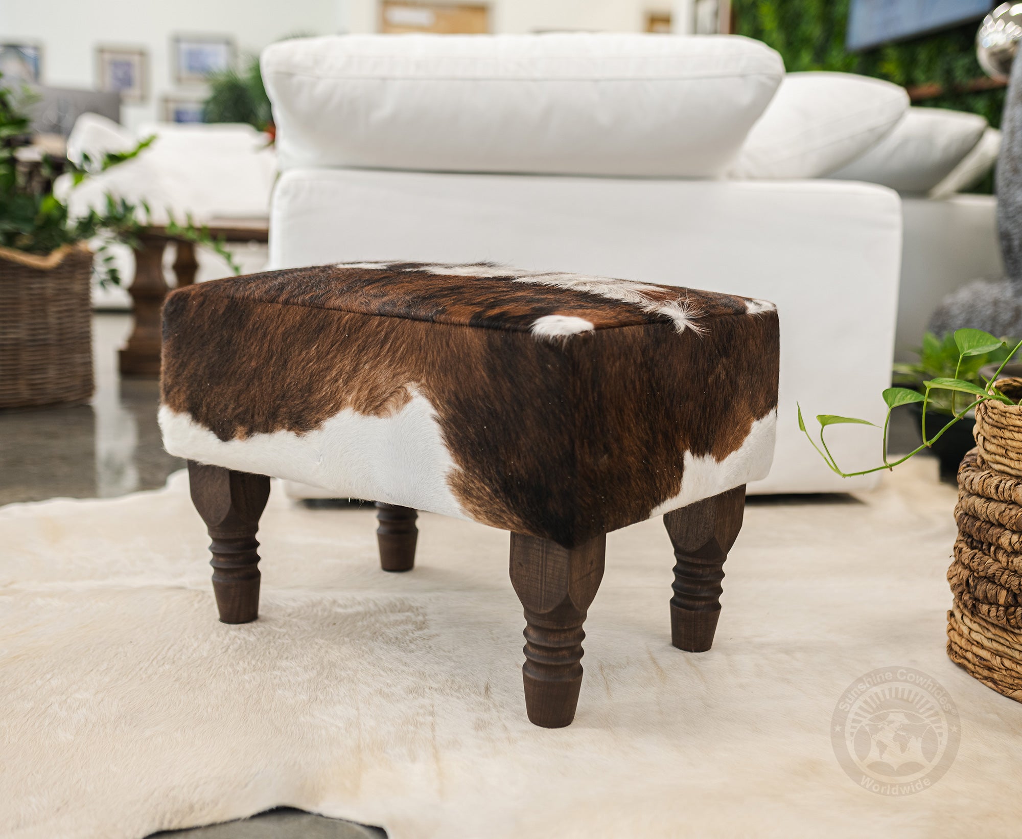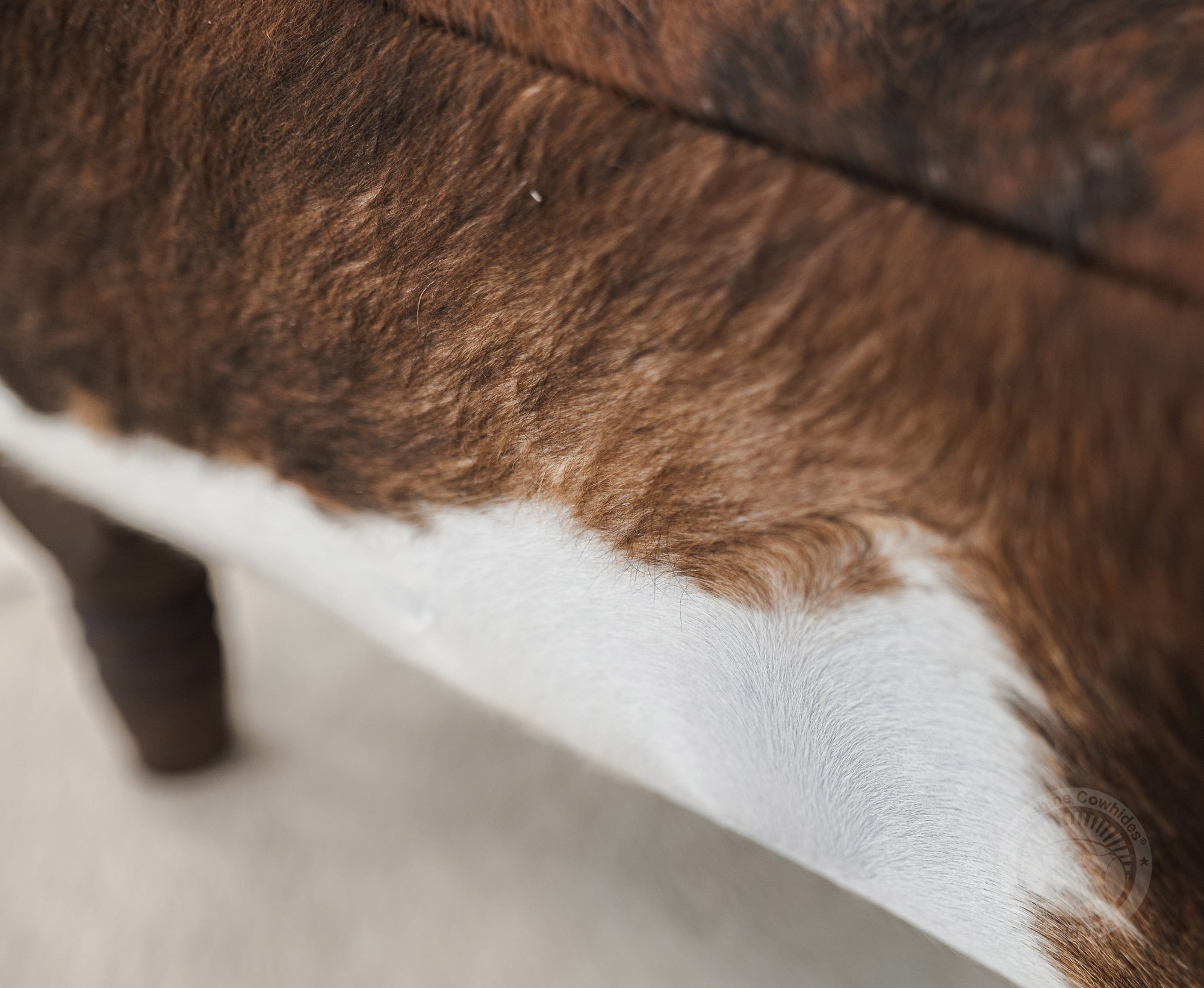 rdy wooden legs offer a strong and stable base, complementing the natural cowhide top.