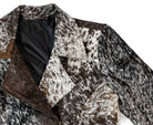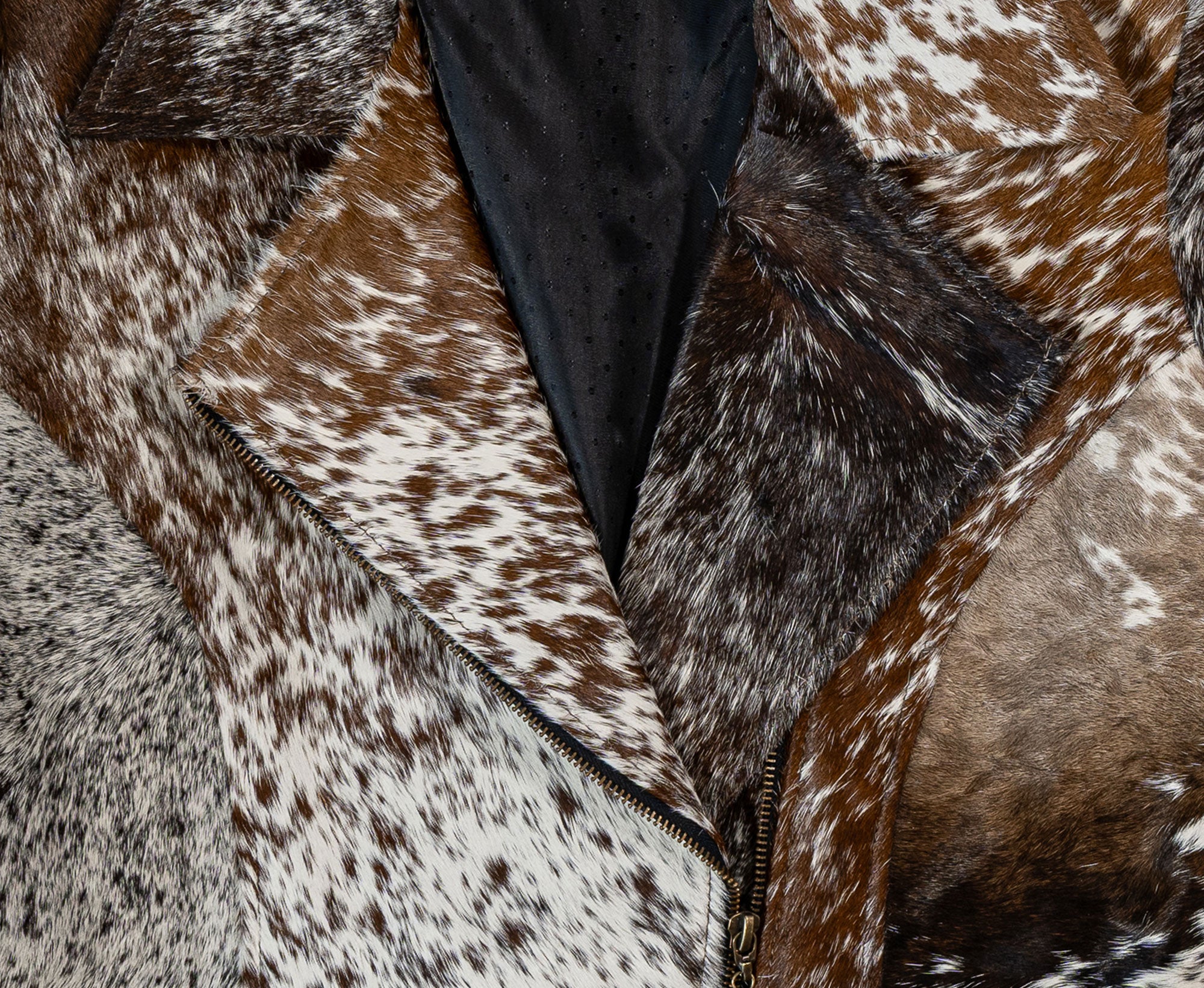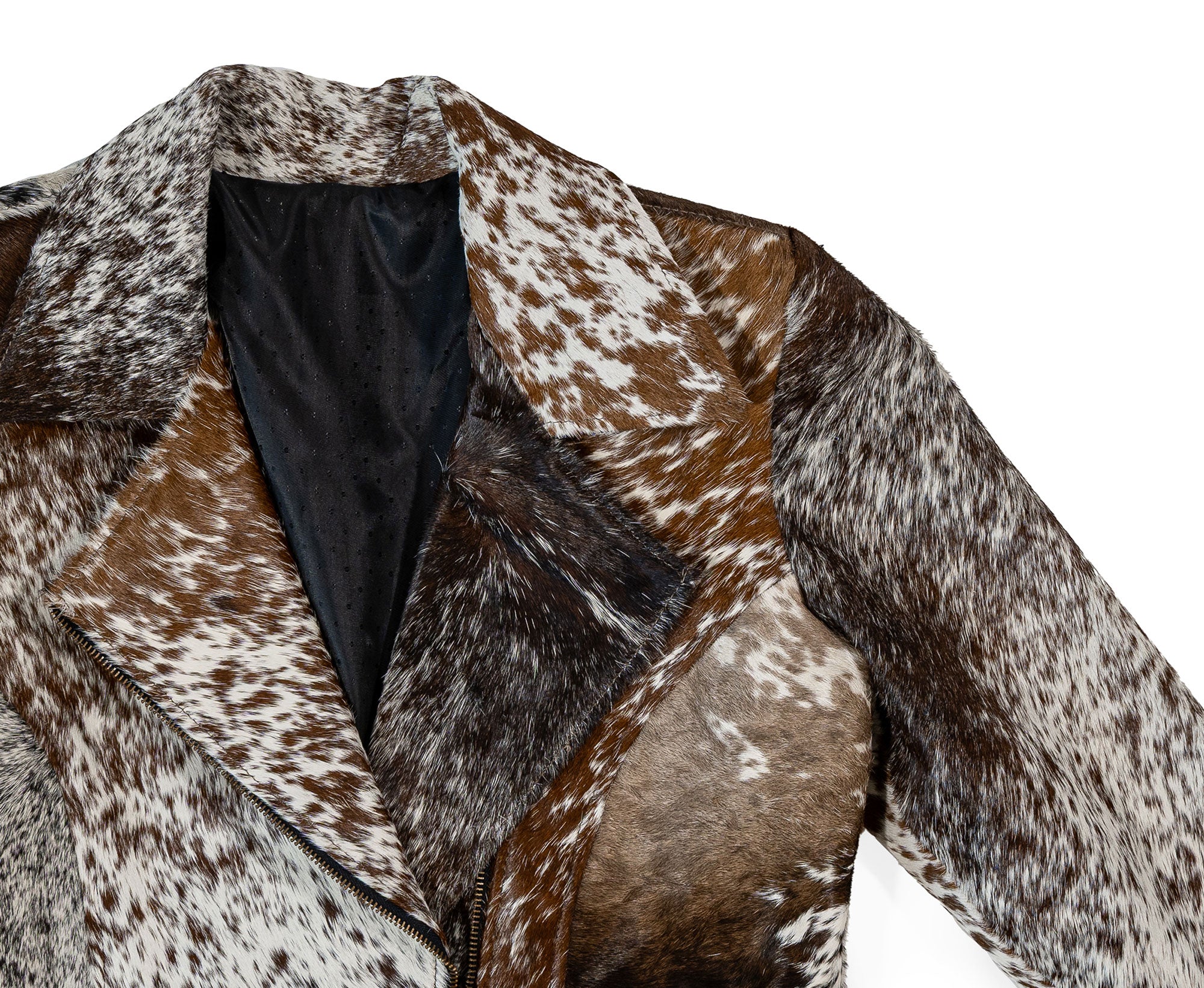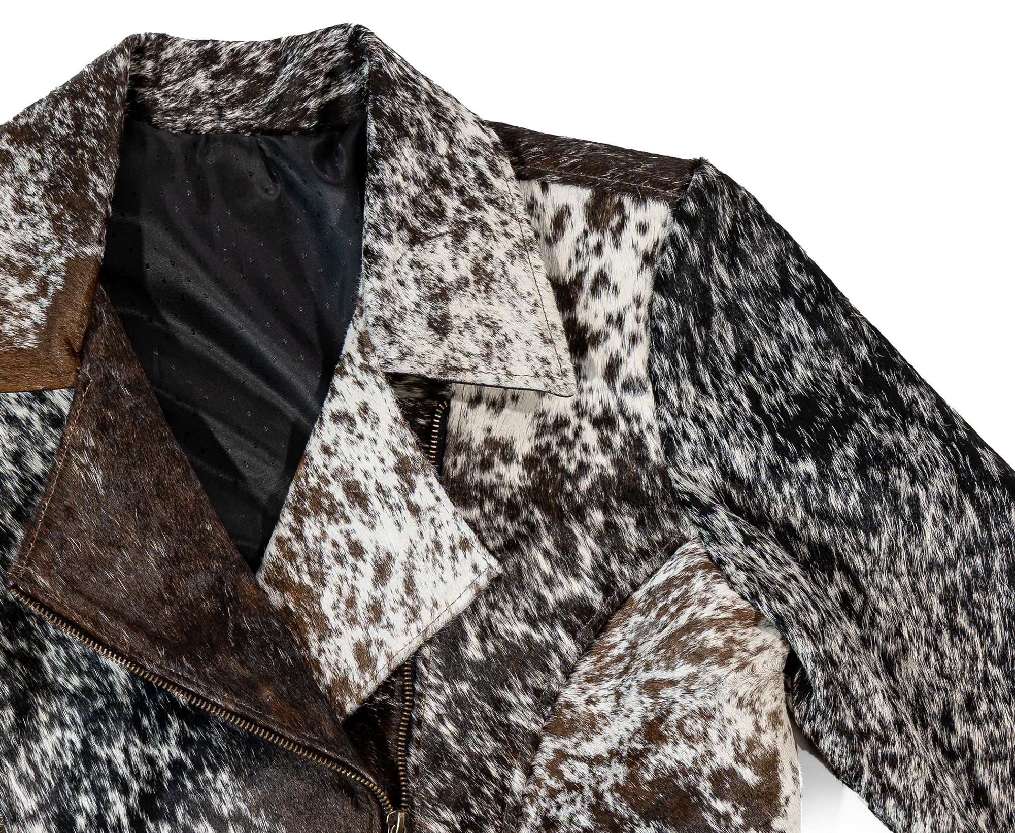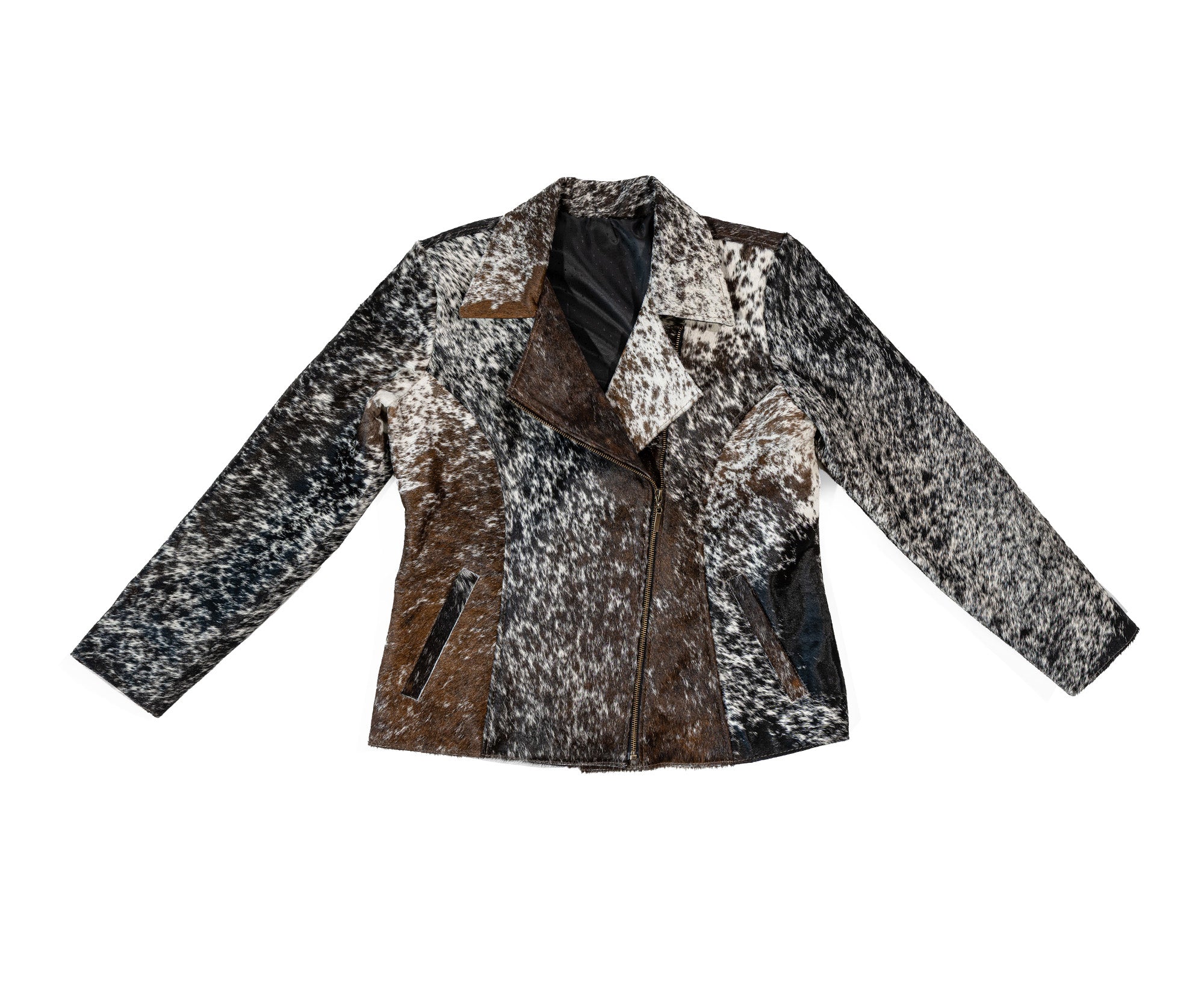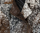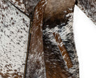 Elevate your wardrobe with this striking, handmade jacket crafted from 100% natural cowhide. Each piece is truly one-of-a-kind, showcasing the beautiful variation and richness of genuine hair-on cowhide in a stunning mix of brown, white, and black tones.