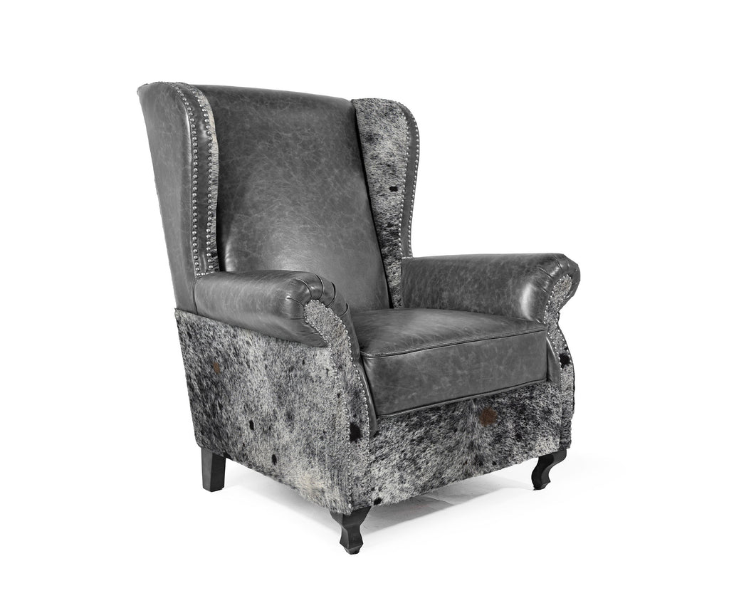 Custom Wingback Chair with Hair On Cowhide Accents - Grey