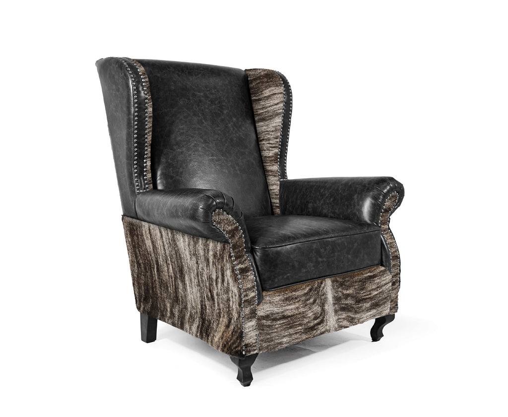Custom Wingback Chair with Hair On Cowhide Accents - Dark Brindle