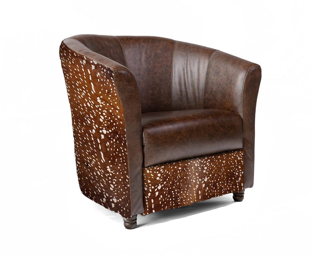 Custom Leather Barrel Chair - Brown Leather with Antelope Print Cowhide Accents