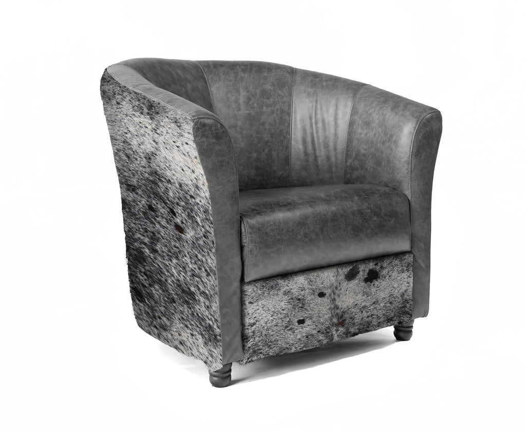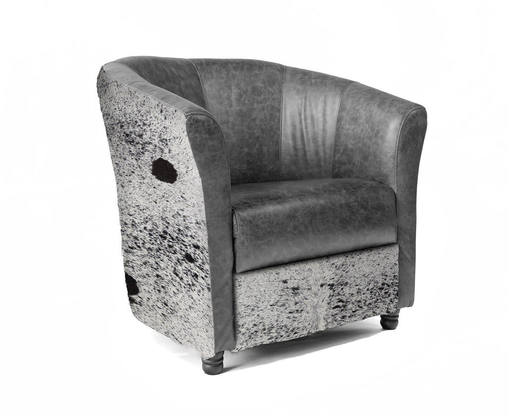 Custom Leather Barrel Chair - Grey Leather with Salt & Pepper Black & White Cowhide Accents