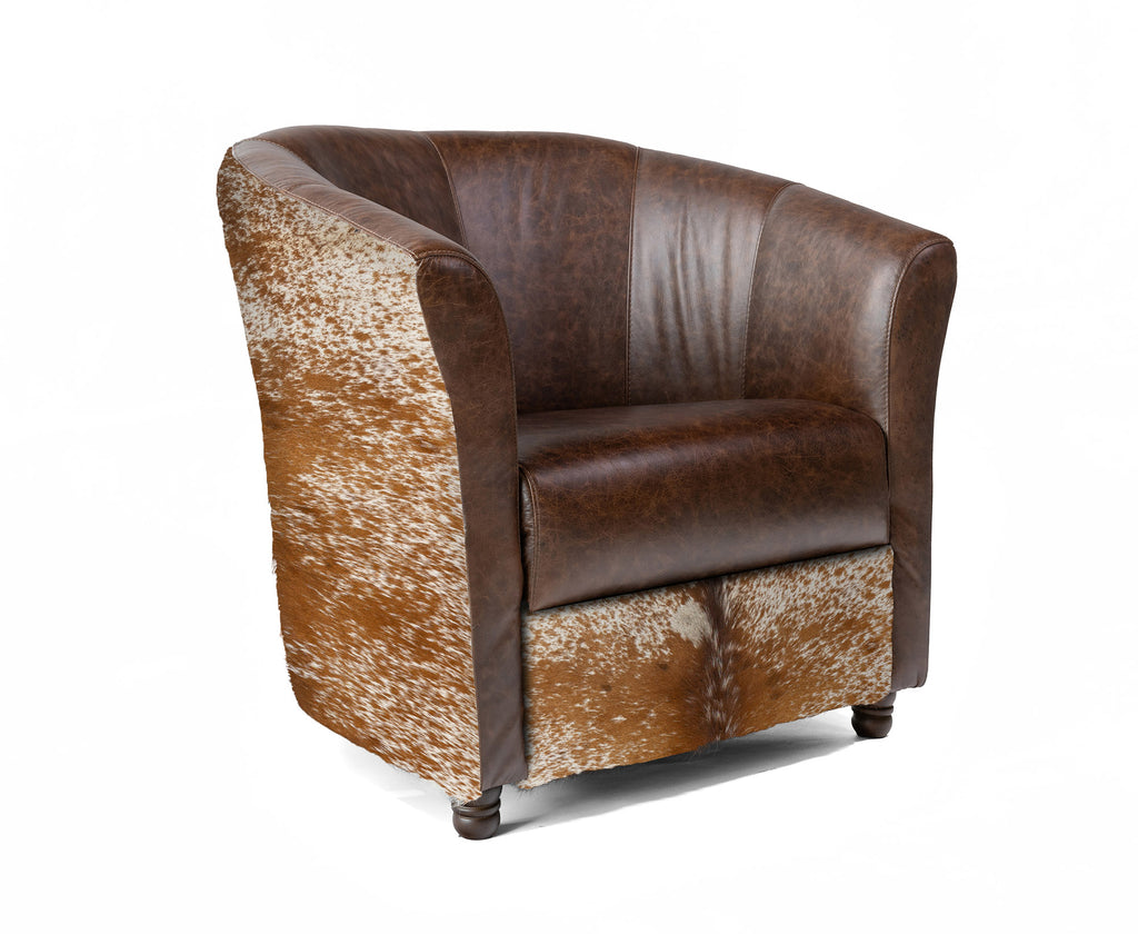 Custom Leather Barrel Chair - Brown Leather with Brown & White Cowhide Accents