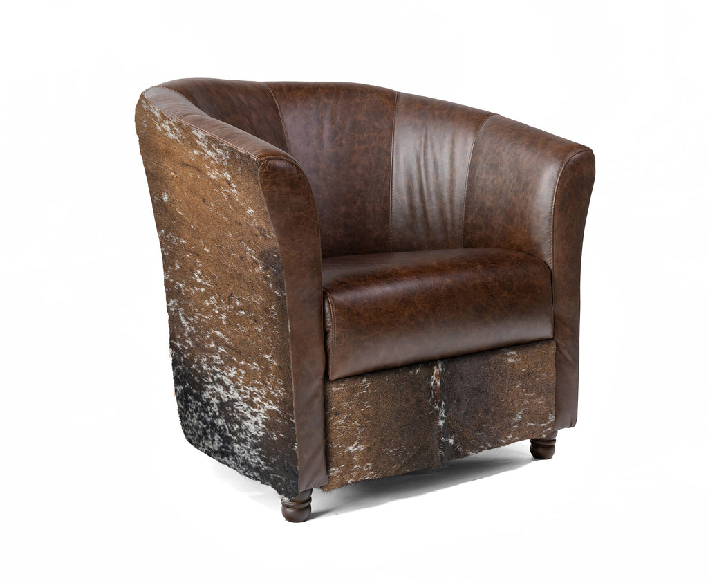Custom Leather Barrel Chair - Brown Leather with Salt & Pepper Brown & White Cowhide Accents