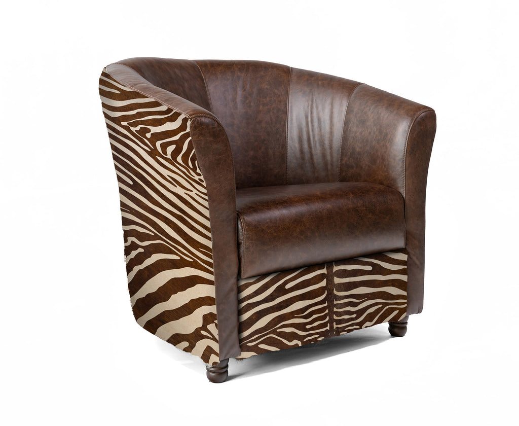 Custom Leather Barrel Chair - Brown Leather with Zebra Print Cowhide Accents